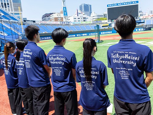 人文社会学部 観光経営学科では、プロ野球チームの公式戦2試合での企画・運営に携わる「帝京平成大学デー」を開催します。観光業界を目指す学生に向けた体験型の授業として、観光経営学科の2年次に実践し、1年次も次年度の実践のためにボランティアとして参加。当日は実際に球場での顧客サービスを学生自身が企画し、様々なグループに分かれ試合を盛りあげる活動を行います。