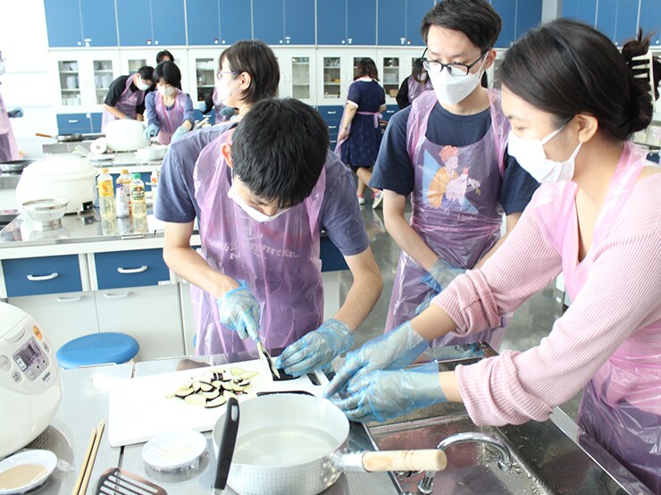 教職員による実演とレシピに従い、日本料理(キノコと秋鮭の炊き込みご飯、ナスと油揚げのみそ汁)と中華料理(トマトと卵の中華炒め)を作りました。調理師並みの手際の良さを見せる学生もいれば、恐る恐る包丁を使う学生もいましたが、班ごとに和気あいあいと日本語で談笑しながら協力して作りました。