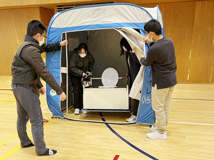 講義の後、体育館に移動し、企業の方々からの説明を受けながら、住民の方々と学生が協力して、避難所で用いられる段ボールベッド・非常用トイレ・簡易パーテーションの組み立て・解体や、被災食の簡易調理と試食等、実践的な活動を行いました。アルファ米の炊き出しや試食は、緊急時の食事の重要性を学ぶ良い機会となり、おいしさも実感できました。