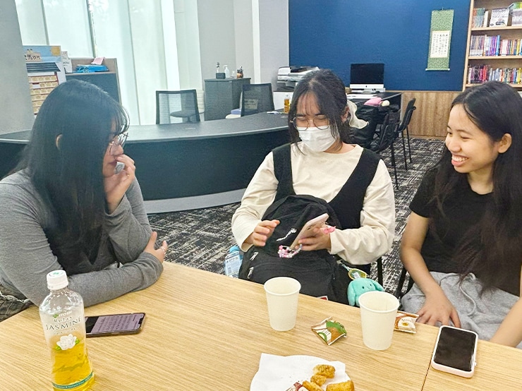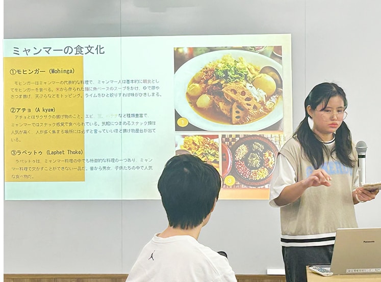 本学のミャンマー人留学生がミャンマーの観光地や文化について日本語でプレゼンテーションを行い、その後にミャンマーのお菓子を、ミャンマーのミルクティーと一緒に楽しみました。ミャンマーの観光地だけでなく、文化や歴史の質問が多く出るなど、時間を忘れるほど話に夢中になり、和やかな雰囲気で会は進みました。