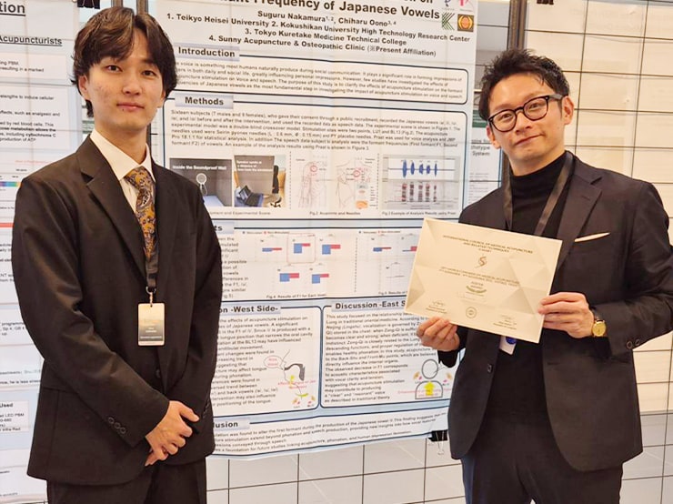本大会のテーマは「Acupuncture from Past to Future : Cure, Care, Evidences, Teaching and Research」であり、中村 講師らの発表は、古典文献に基づく経穴(ツボ)選択と日本鍼灸特有の繊細な刺激法が、発声の要となる母音フォルマント周波数にどのような変化をもたらすかを科学的に検証したものです。