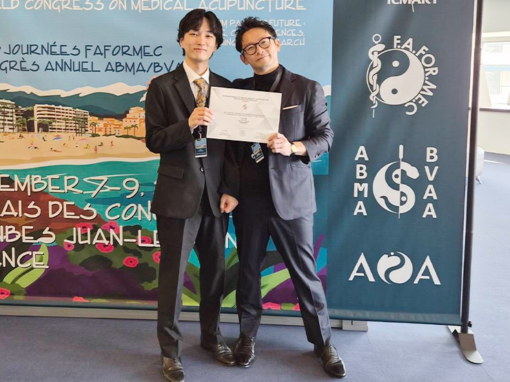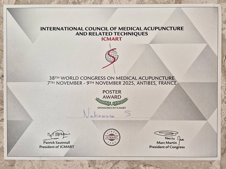 11月7日(金)から9日(日)にかけてFrance Antibes Juan-les-Pinsで開催された鍼灸関連の国際会議「38th ICMART World Congress on Medical Acupuncture」にて、ヒューマンケア学部 鍼灸学科 中村 優 講師と、共著者である本学鍼灸学科卒業生、大野 智陽さん(2022年度卒業)が発表した演題「Effect of Acupuncture Stimulation on Formant Frequency of Japanese Vowels」が、Poster Awardを受賞しました。
