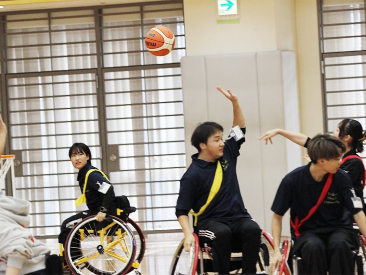 このフェアは、「障がいの有無に関わらず共に行えるスポーツの体験」をテーマとしています。昨年に引き続き「車いすツインバスケットボール」を体験のスポーツとし、車いすツインバスケットボールの選手5名にもご協力いただき、参加者と選手が共にゲームを楽しめる場を提供しました。