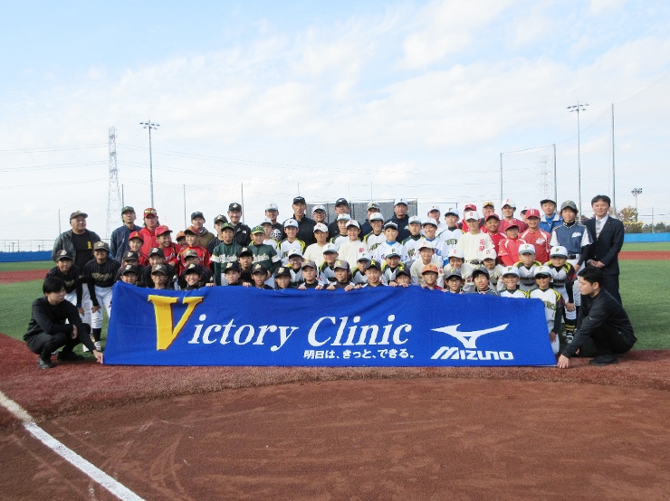 さらに、竣工記念式典のイベントの一環として、スポーツメーカー・ミズノ株式会社様のご協力のもと、「ミズノビクトリークリニック」を実施いたしました。これは、トップアスリートを招いて実技指導を行うもので、当日は市原市内の少年野球チーム8チーム、約60名の小学生が新球場に集結。講師としてお招きした元プロ野球選手の小笠原 道大様、そして和田 一浩様のお二人から、熱心な指導を受ける貴重な交流の場となりました。