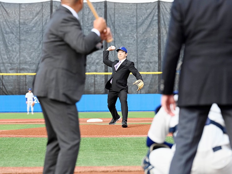 また、始球式では、冲永 佳史 理事長が投手、和田 佑一 副学長 スポーツ局長が審判、硬式野球部の原 克隆 監督が打者を務め、硬式野球部員一同が守備に就き、本学の新たな野球の歴史がスタートを切りました。