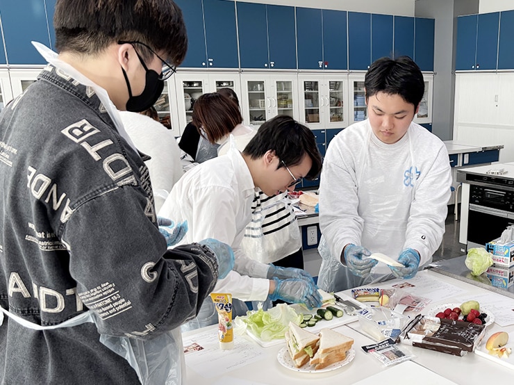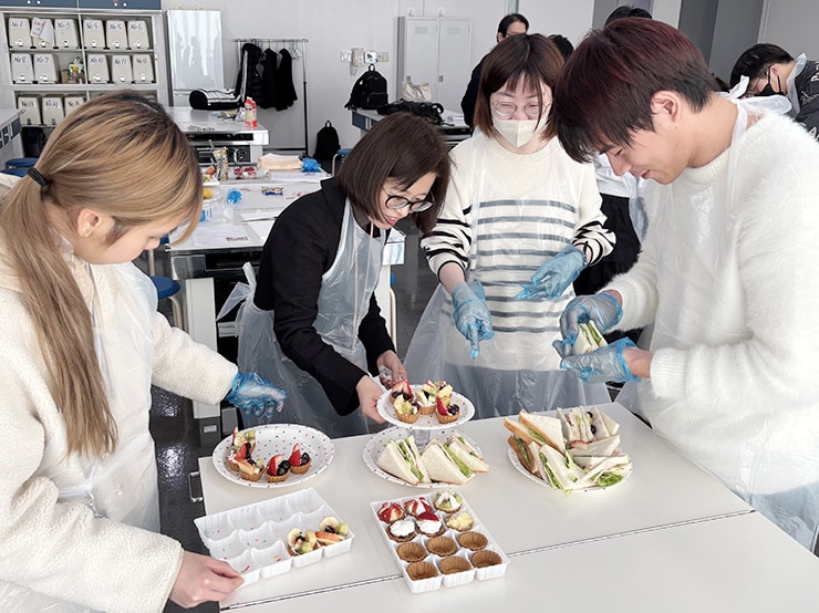 グループごとに連携をとり、真剣に料理に取り組んだあとは、個性光るサンドイッチとタルトとともに紅茶を楽しみました。