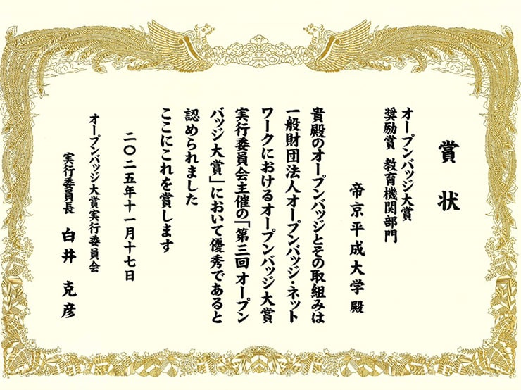 本学では、学生の主体的な学びを支援し、学修成果やスキルの可視化を図るため、オープンバッジの導入と活用を積極的に推進してまいりました。今回の受賞を励みに、今後も教育の質の向上と学修者支援の充実に努めてまいります。