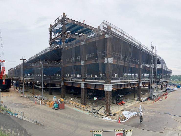 先月から取り掛かっておりました鉄骨建方準備工事が順調に進み、予定通り10月から高層棟の鉄骨工事が本格的に開始されました。柱となる鉄骨を取り付け、水平方向に柱と柱を繋ぐ部材である梁(はり)などの組み立てが順次行われている状況です 。引き続き高層棟の鉄骨工事を進め、順次、低層棟(体育館・講堂・食堂・図書館)の鉄骨工事に着手する予定となります。