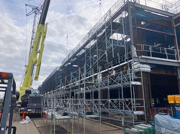10月から本格的に開始された高層棟の鉄骨工事が順調に進められています。建物全体を支える柱や梁(はり)といった主要な鉄骨部材が組み立てられ、新校舎(新しい身体)の骨格が、よりはっきりと形作られてきています。引き続き高層棟の鉄骨工事を継続しつつ、予定通り、低層棟(体育館・講堂・食堂・図書館)の鉄骨工事にも順次着手することで新校舎全体の形状が明確になっていきます。
