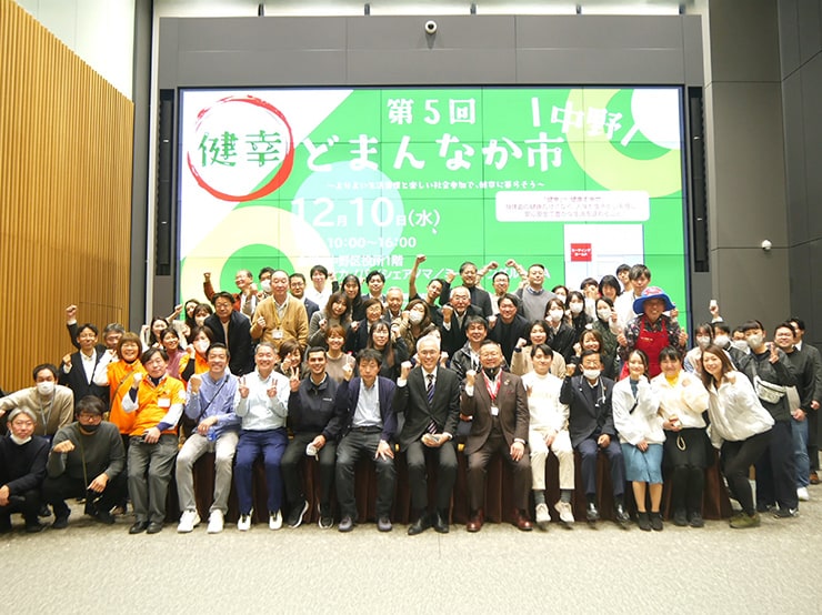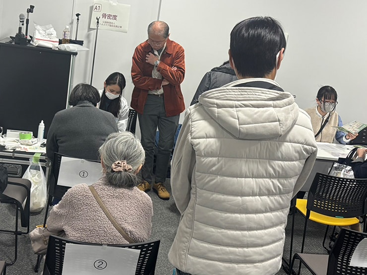 12月10日(火)中野区役所において「第5回 中野健幸どまんなか市」が開催されました。本イベントは、中野区とパートナーシップ協定を結ぶ団体等が連携し、区民の健康啓発や健康測定を目的として継続的に実施されている取り組みです。本学からは薬学部の学生4名が参加し、地域住民を対象とした骨密度測定のサポートをはじめ、会場運営や終了後の片づけ、ミーティングへの参加など、さまざまな形でイベントを支えました。