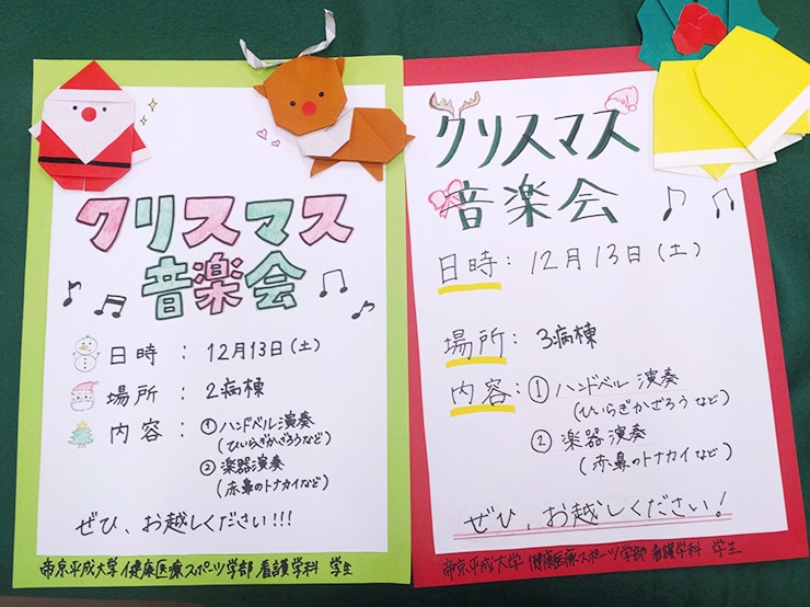 12月6日(土)・13日(土)に市原市内の実習病院である医療法人白百合会 市原鶴岡病院内で開催されたクリスマス会に、健康医療スポーツ学部 看護学科の学生18名と教員7名が、ボランティアとして参加しました。2日間で3つの病棟を訪れ、各病棟で学生が企画したハンドベル演奏、サックス・フルート・ピアノでのクリスマスメドレー、ダンス、合唱、クイズなどを行いました。