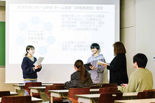 健康や医療、スポーツ領域で幅広い学問を学び、地域住民と密着した医療人を養成する健康医療スポーツ学部では、地域医療を核に多角的なチームアプローチについて段階的に学修します。2年次にはそれぞれの職種の役割について学び、他職種との連携をイメージしながら、チーム医療への理解を深めます。3年次には、医療・保健・福祉の現場でチーム医療の一員として活動できる知識と技術について、演習や事例検討を通して学び、チームで連携し協働するための実践能力を養います。